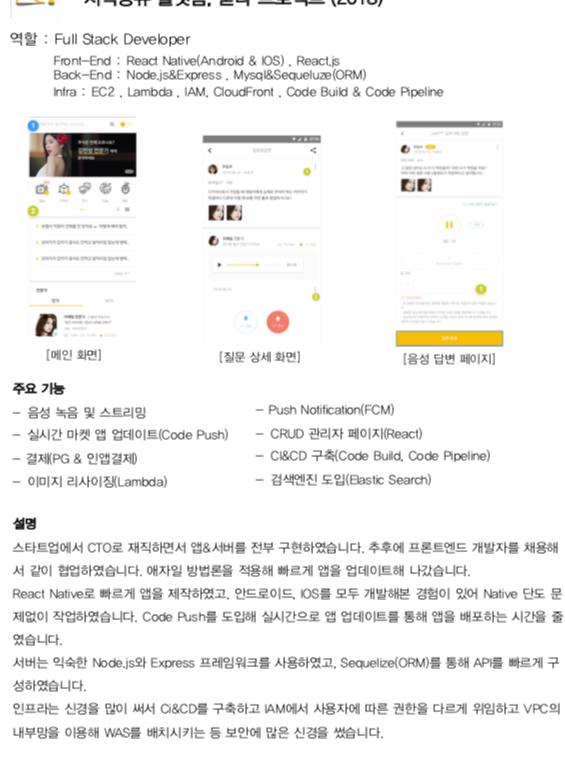 했던 프로젝트들 중 표현하기 쉬운 것들을 모았다. 토이 프로젝트들을 포함하면 포트폴리오가 양은 많아지고 보기는 어려워질 것 같았다. 그래서 창업하면서 개발했던 것들, 아웃소싱했던 것들만 추려서 작성했다.