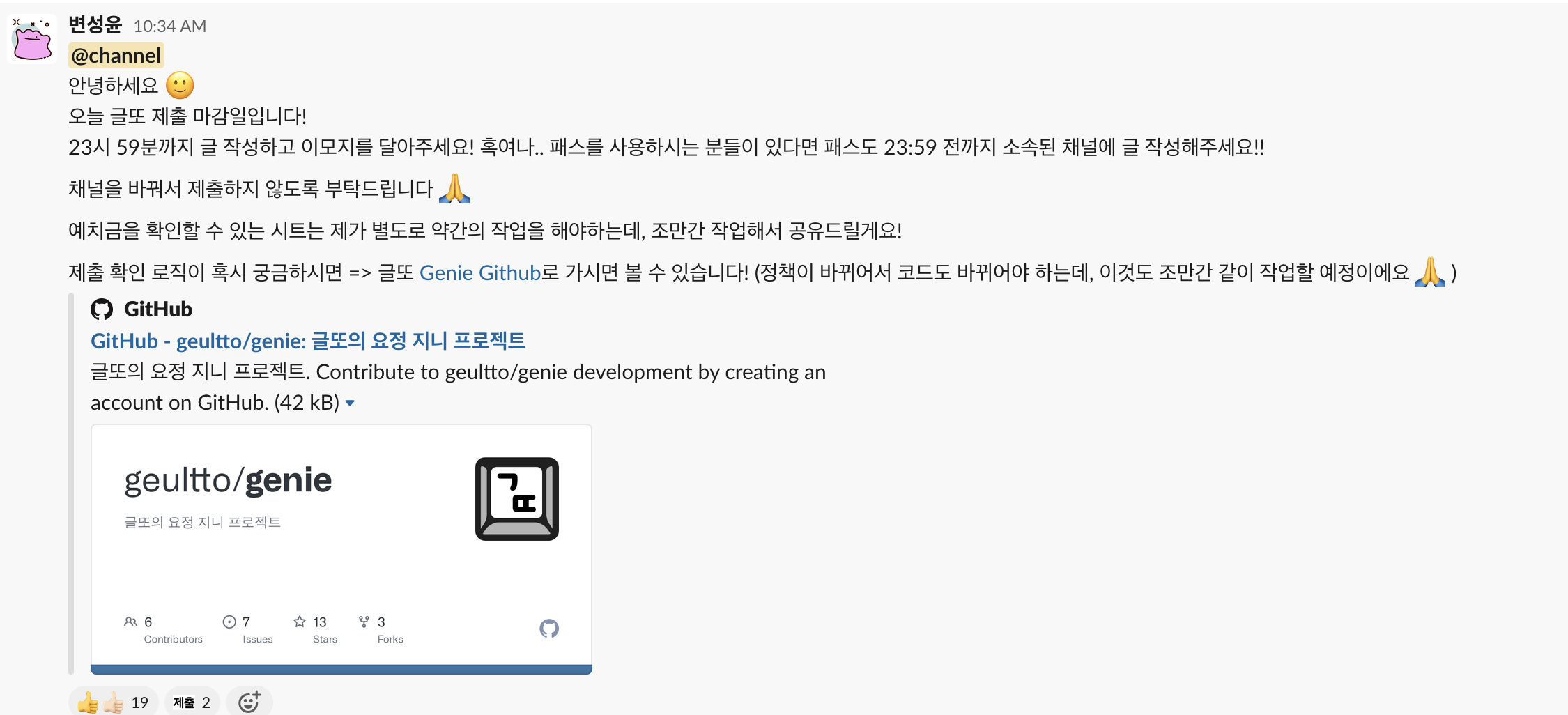 회사에 들어가서도 글을 꾸준히 써야겠다고 다짐했지만 쉽지 않았다. 그렇게 나약하게 하루하루를 보내고 있던 때, 글또를 알게 되었다. 글쓰는 또라이의 약자인 글또는 개발자들이 모여 서로 동기부여 해주며 글을 쓰는 모임이다. 나같은 나약맨에게 딱 필요한 모임이다..! 참여하게 되면, 격주간 총 10편의 글을 작성하게 되며 같은 직군의 사람들에게 피드백을 받을 수도 있다. 또한 개발자들끼리 모여 네트워킹도 가능하여, 평소 개발자 친구들이 부족한 왕따인 나에게 정말 안성맞춤이었다.