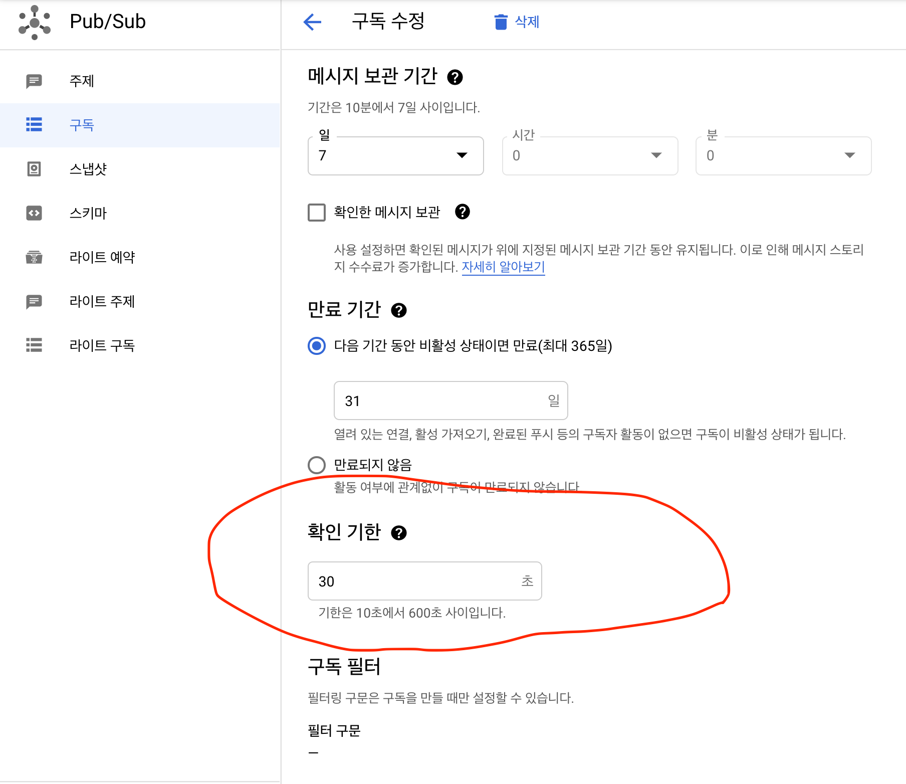 Console에서 구독 수정에 들어가면 아래와 같이 확인 기한(ack deadline)에서 설정이 가능하다